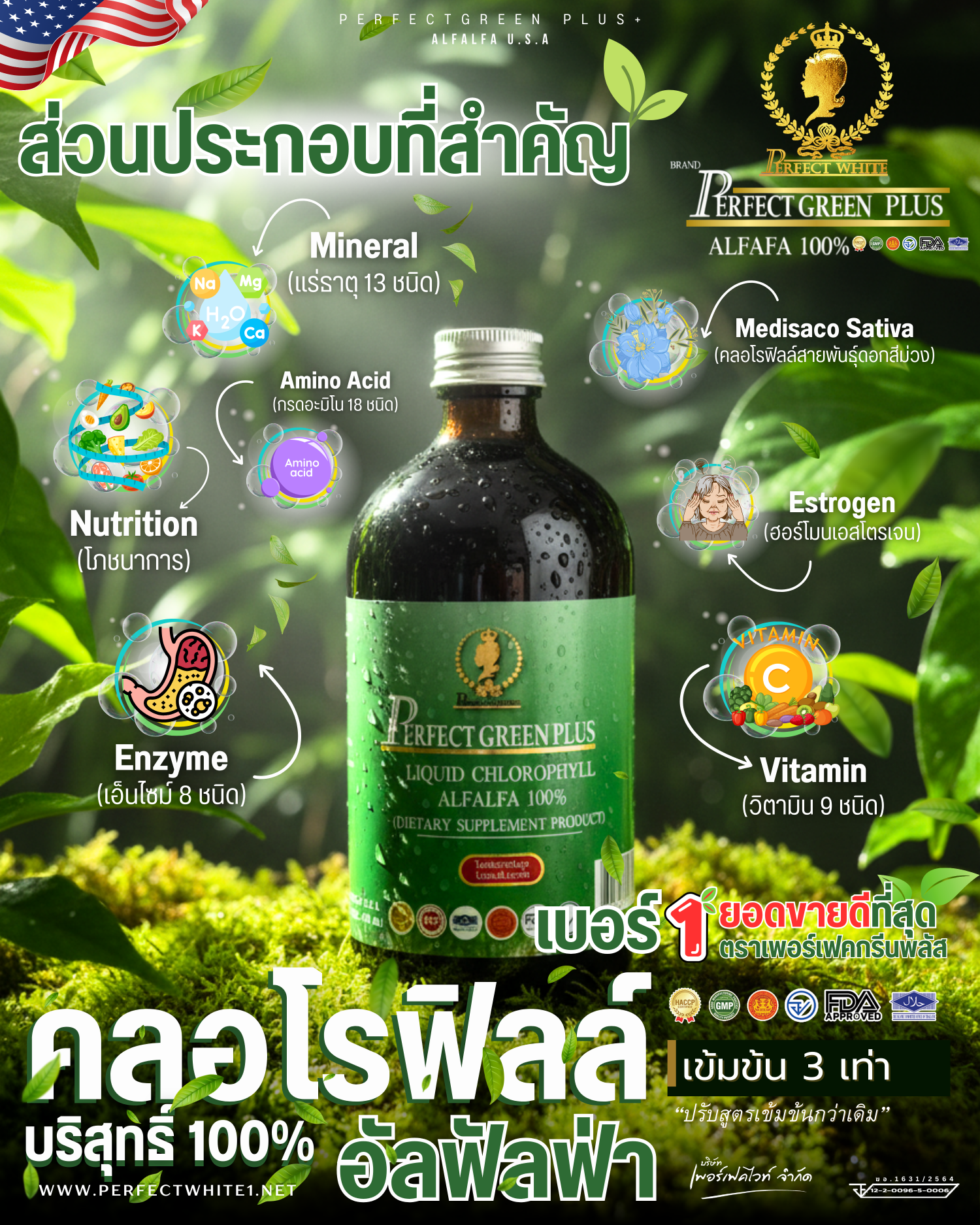คลอโรฟิลล์ของ Bernard Jensen เราคัดสรรคุณภาพเน้นวัตถุดิบ Chlorophyll สายพันธุ์ที่ดีที่สุดของอเมริกาส่งตรงมาที่ประเทศไทย เจ้าเดียวที่ได้รับลิขสิทธิ์ Perfect White Co., Ltd. ที่ได้นำคลอโรฟิลล์ 100% ที่มียอดขายมากที่สุดในอเมริกาและได้รับการยอมรับจาก BHJV และเป็นคลอโรฟิลล์ที่เน้นคุณภาพ ทุกหยดทุกขวดจึงมั่นใจได้ ในนาม Perfect Green Plus